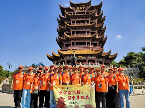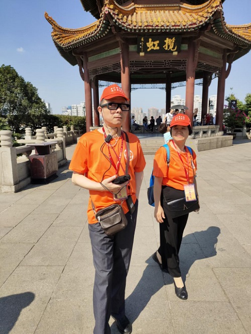 图为视障朋友佩戴智能导盲辅助器具游览黄鹤楼
