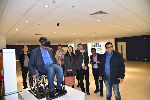 随后,Tata司长一行来到国家辅助器具华南区域中心,王睦雄主任向Tata司长一行介绍了华南区域中心运作模式、整体规划设计、职能体系和目前各项目开展进度等内容,并带领Tata司长一行参观一楼高科技展厅和二楼辅具科普展厅,现场体验语音识别技术及VR虚拟现实模拟场景、手势感应系统、AR人工智能产品建模3D展现等内容。